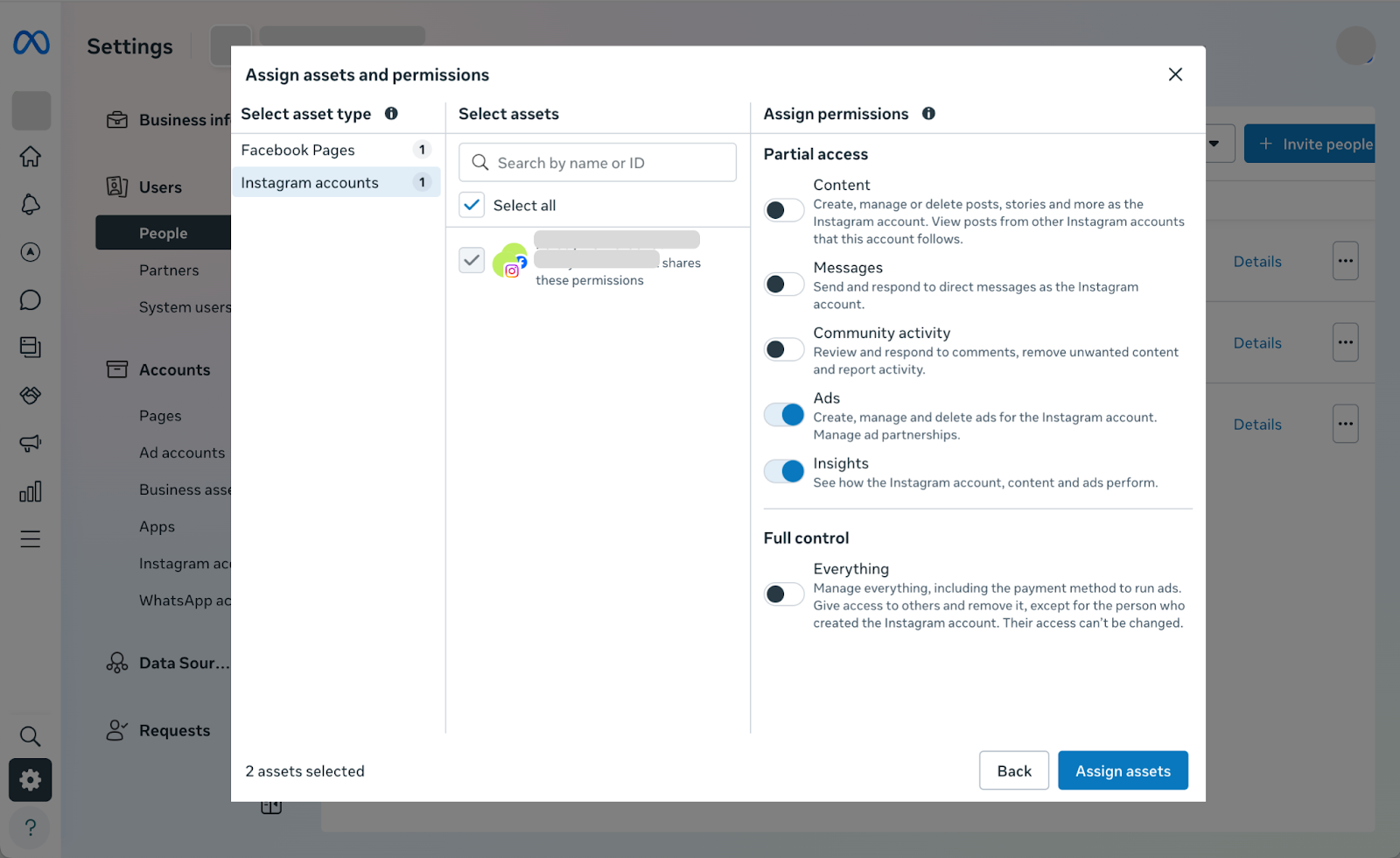 - In the People list, in the row with your name the “Business portfolio access” it should display as “Full control” of “Everything” or “Facebook page, Instagram page”